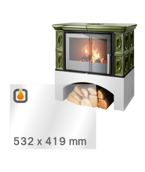 Žáruvzdorné sklo je ploché, čiré. Propouští veškeré teplo z topeniště do vytápěného prostoru, zůstává rozměrově stabilní i po intenzivním zahřátí a je vysoce odolné vůči tepelným šokům. Maximální teplotní odolnost je 800 °C. Jedná se o špičkovou kvalitu – prémiové žáruvzdorné ROBAX® sklo od SCHOTT, předního německého výrobce. Sklo má tloušťku 4 mm a přesný rozměr 532 x 419 mm, což zajišťuje perfektní kompatibilitu s modelem ABX PANONIE EXKLUSIVE. Je plně čiré, bez potisku, bez obvodového černého rámečku a oboustranně totožné, takže instalace je snadná a bez rizika nesprávného umístění.
